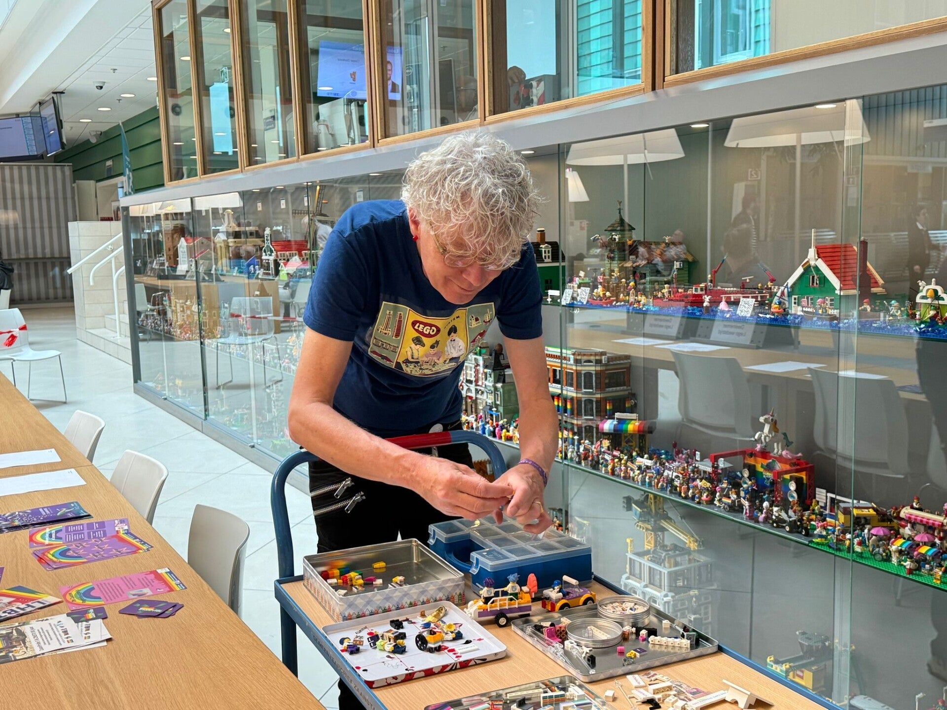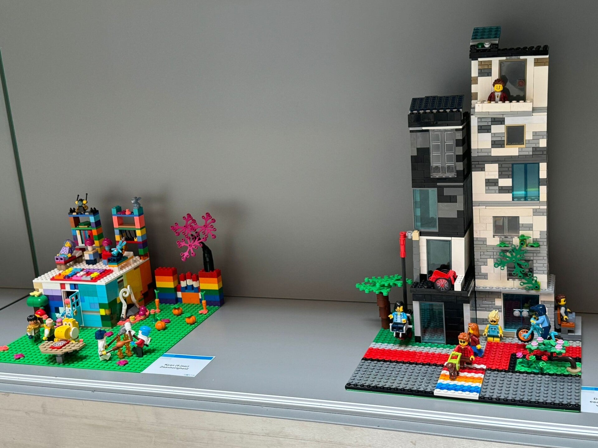 In de bovenste vitrine zijn zowel de wapens als een aantal karakteristieke gebouwen van de zeven verschillende voormalige gemeenten in Lego te zien. Via QR-codes is aanvullende informatie te verkrijgen over deze gebouwen en de geschiedenis erachter. Op de middelste vitrine is ZaanPride in Lego te zien. Het is een stoet van honderden Lego-minifigures in alle kleuren van de regenboog, zoals deze op zaterdag 8 juni door Zaanstad zal trekken. De onderste vitrine is gereserveerd voor de resultaten van een heuse Legobouwwedstrijd. Daarnaast is in de vitrines van het Gemeentearchief een tentoonstelling van oude LEGO vanaf de jaren zestig van de vorige eeuw te zien.